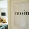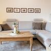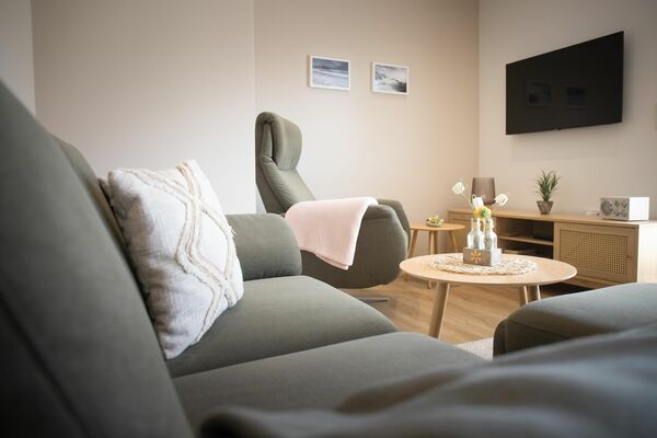 - Wohnbereich: Der helle und einladende Wohnraum ist geschmackvoll eingerichtet und verfügt über große Fenster, die viel Tageslicht hereinlassen. Ein gemütliches Sofa lädt zum Entspannen ein, während ein Flachbildfernseher für Unterhaltung sorgt.